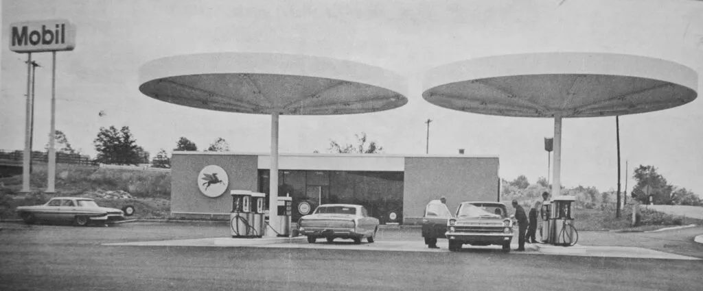 The idea of the red O reinforces a design concept to use circular canopies, pumps, and display elements for a distinctive and attractive look. It also serves to help people pronounce the name correctly (Mo-bil, not Mo-bile), and of course to add a single memorable and distinctive element to an otherwise very simple lettering style. At the same time, the redrawn flying red horse is placed at a large size on the service station building itself.